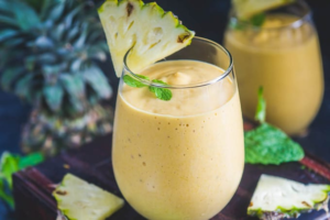 Pineapple is a rich source of vitamins and minerals especially Vitamin C and manganese providing 131% and 76% of your daily needs for Vitamin C and manganese. Vitamin C is supposed to play a role in wound healing, help in making the immune system stronger to prevent infections, and might act to prevent heart diseases and certain cancers. Yogurt present in the smoothie is a good source of calcium and proteins thus helping to build your cells and bones. Greek yogurt which is a thicker curd or yogurt can also be substituted for the nonfat plain yogurt. Greek yogurt has almost double the amount of proteins as compared to nonfat plain yogurt.