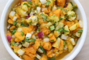Salsa can be used as a topping for a salad, as a taco or a burrito topping or even in the rice. This is a great low calorie fat free salsa which can itself be eaten, thus helping in reducing your appetite and providing a sense of fullness. To add more proteins into the salsa, you can add boiled chickpeas or moong dal sprouts. Papaya in the salsa is an excellent source of Vitamin A, Vitamin C and folate. Vitamin A helps in preventing us from getting sick, is involved in vision, and helps in developing your cells. Vitamin C helps in wound healing and is an antioxidant. Folate helps to build our red blood cells. Moreover, it is very much needed during periods of rapid growth, especially during fetal development and pregnancy.